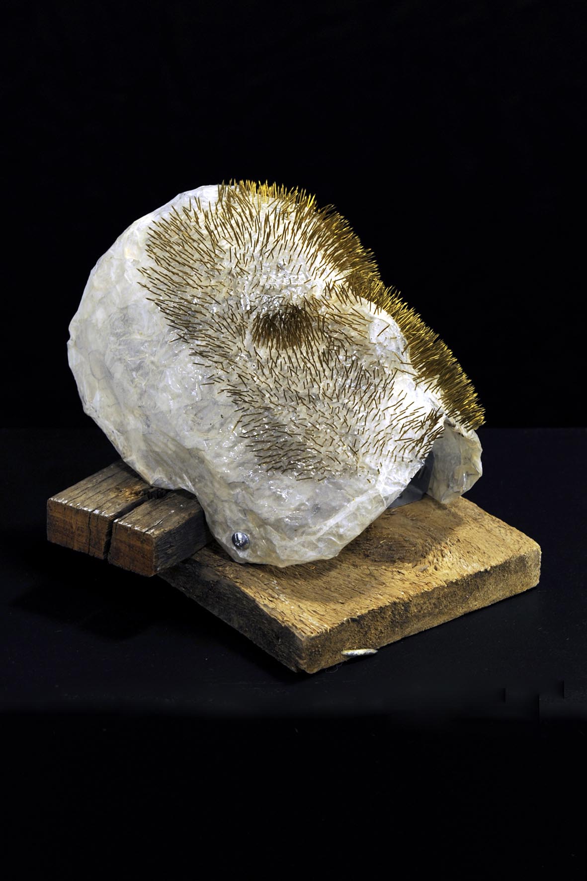 Elisabeth Weissensteiner , Spiked Face, 2006, wire mesh, shellac, tape, resin, pins, timber, 20 x 20 x 10cm