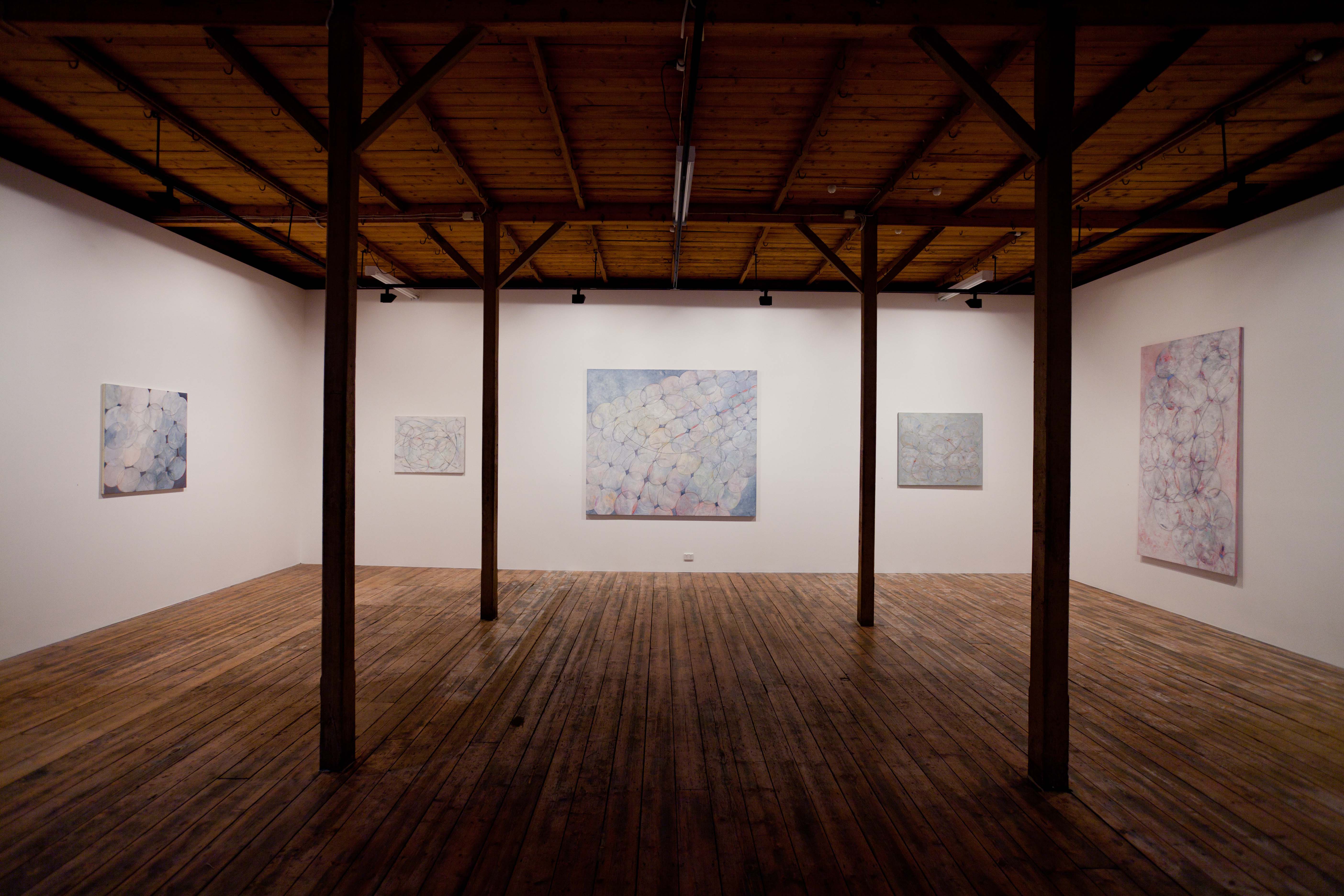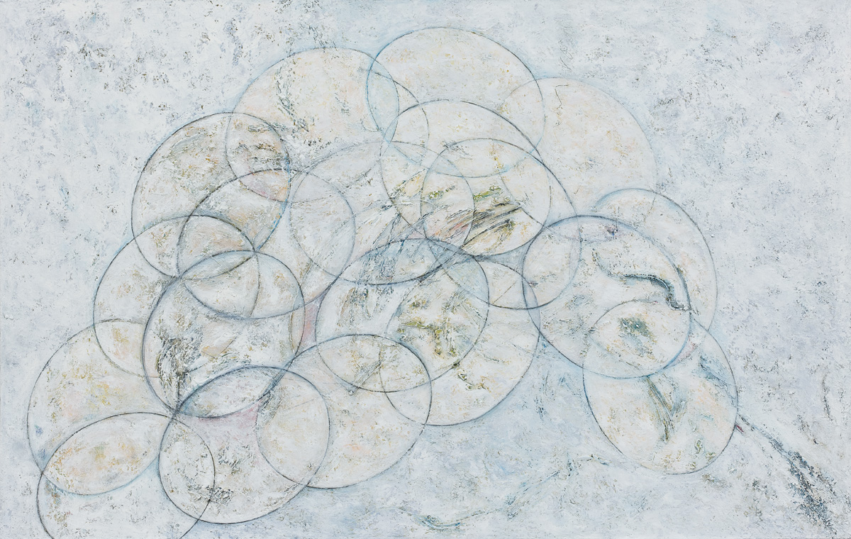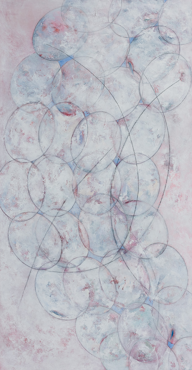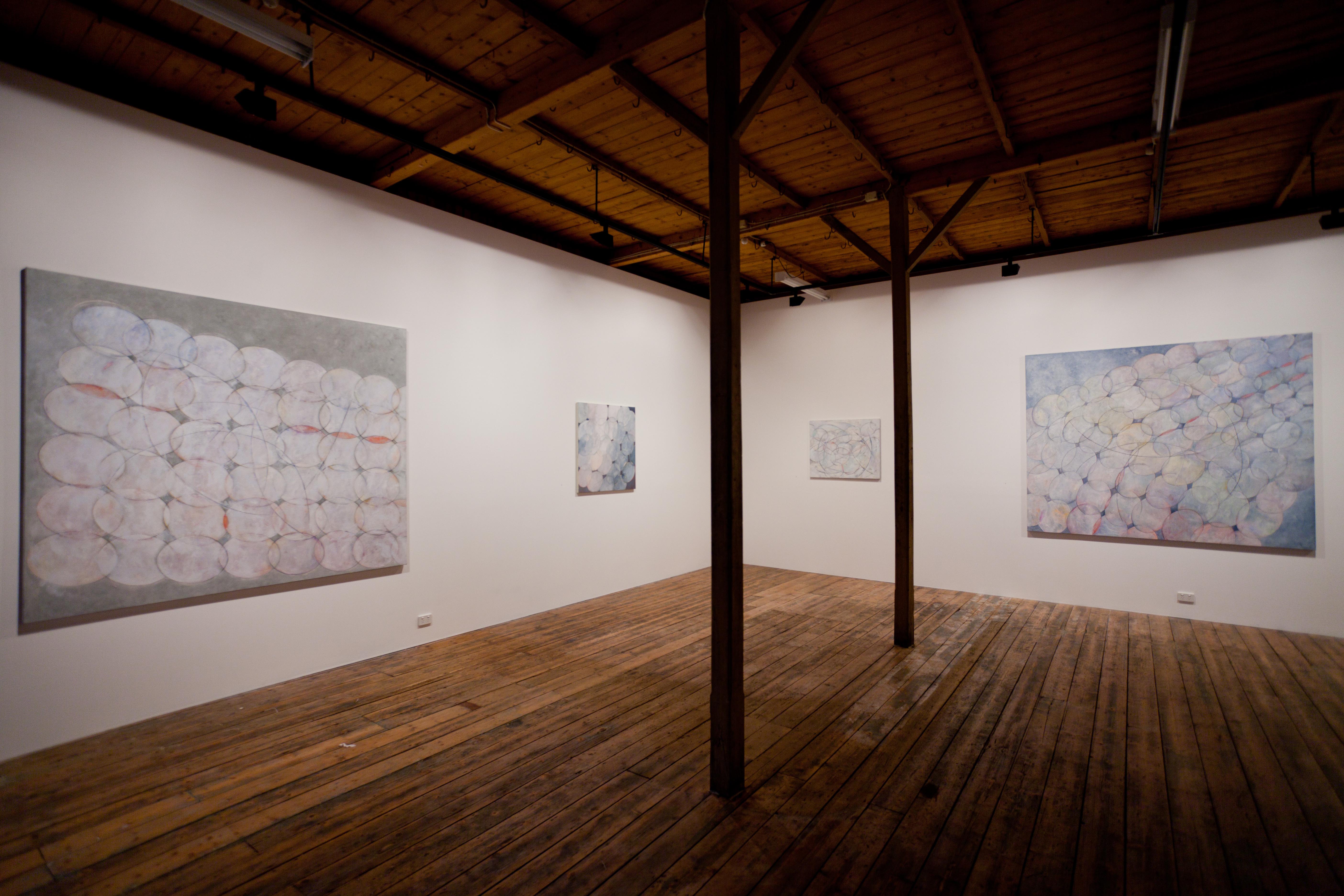 Carolyn Fels’ new series of paintings Continuum combines elliptical forms and linear markings immersed in a muted palette. Fels engages with the formal aesthetics of Modern Abstraction, but there is no rigidity to the geometry of her paintings. Drawing inspiration from the natural world Fels creates fields of effortless movement and variation. Her fluid shapes float, shudder and sweep across the canvas inspiring a wistful meditation in their eternal repetition.