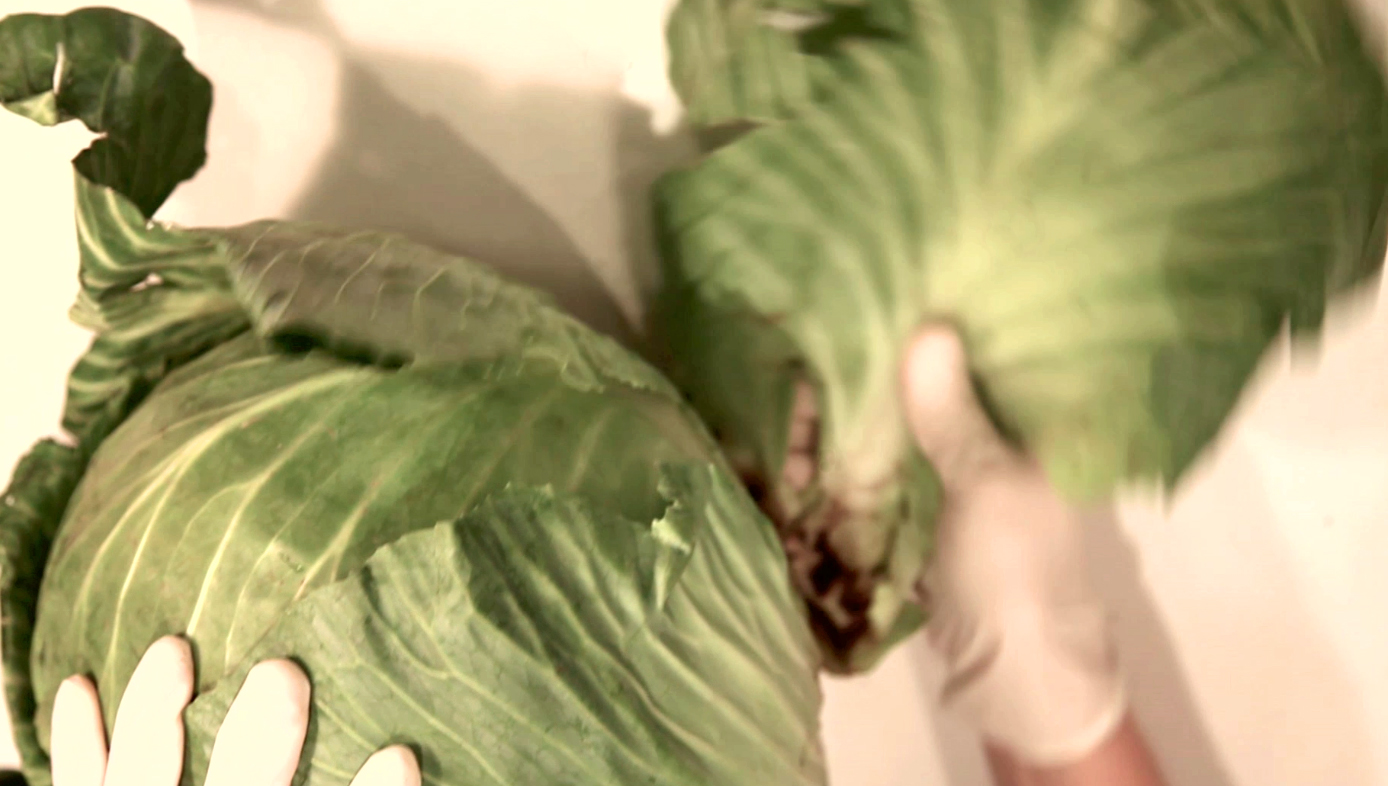 In Claire Anna Watson’s work, Endocardium, the cabbage, a mundane and uninteresting vegetable, holds the artist’s fascination as a sculptural object. Unveiling its gnarled and freakish core, through a systematic unwrapping, Watson exposes this most banal of vegetables to know it more intimately.