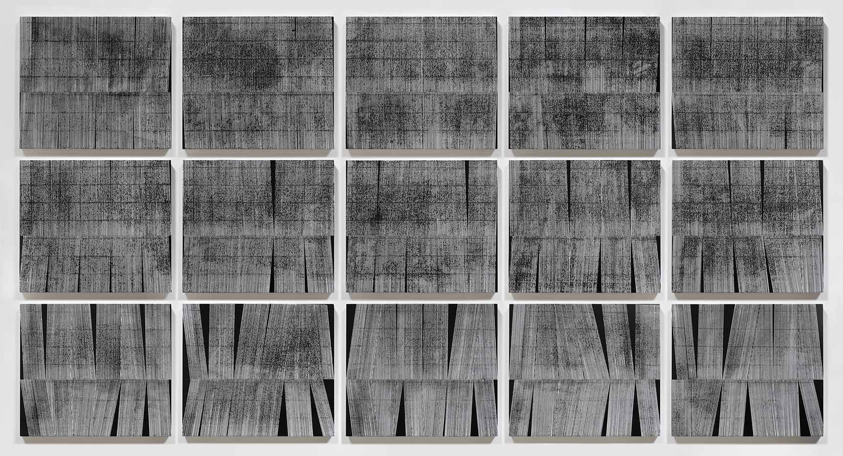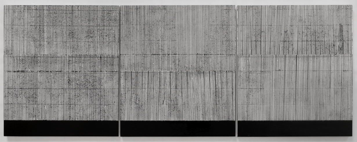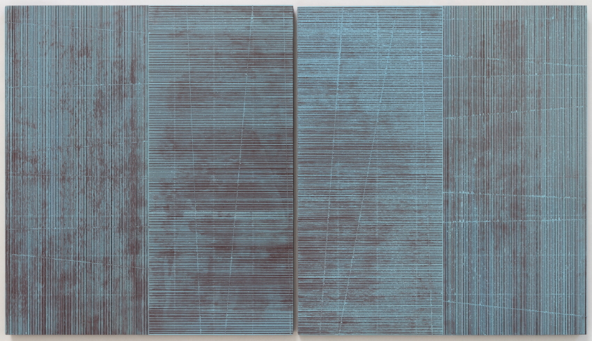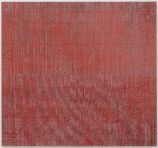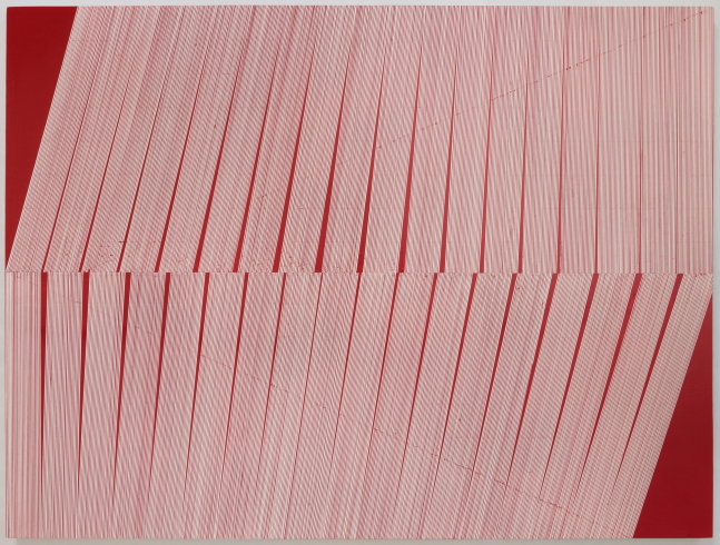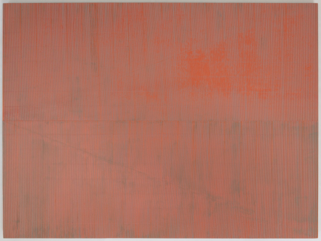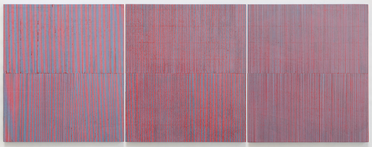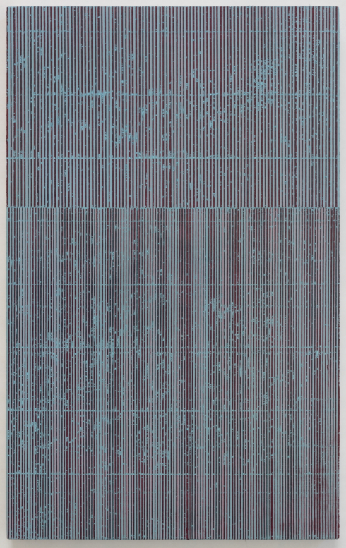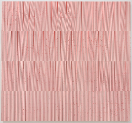 Emma Langridge’s paintings, although physically composed of few elements; line, proportion, colour and medium, visually the works are incredibly complex. Langridge says her work is the ‘accumulated result of the repeated action of hand and arm, left to right, upper edge to lower, mapping an expansion of time and space.’