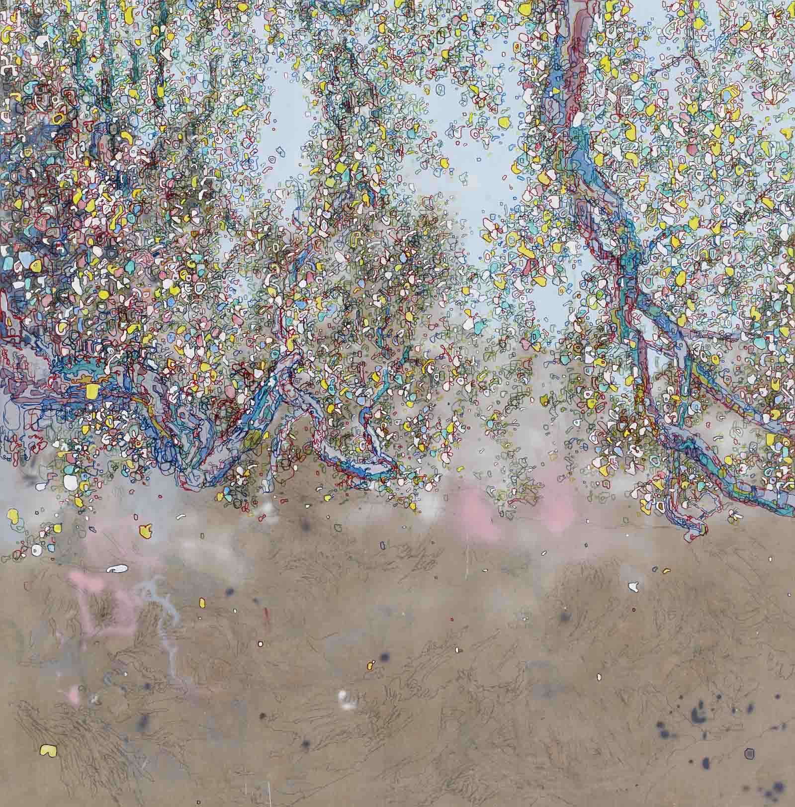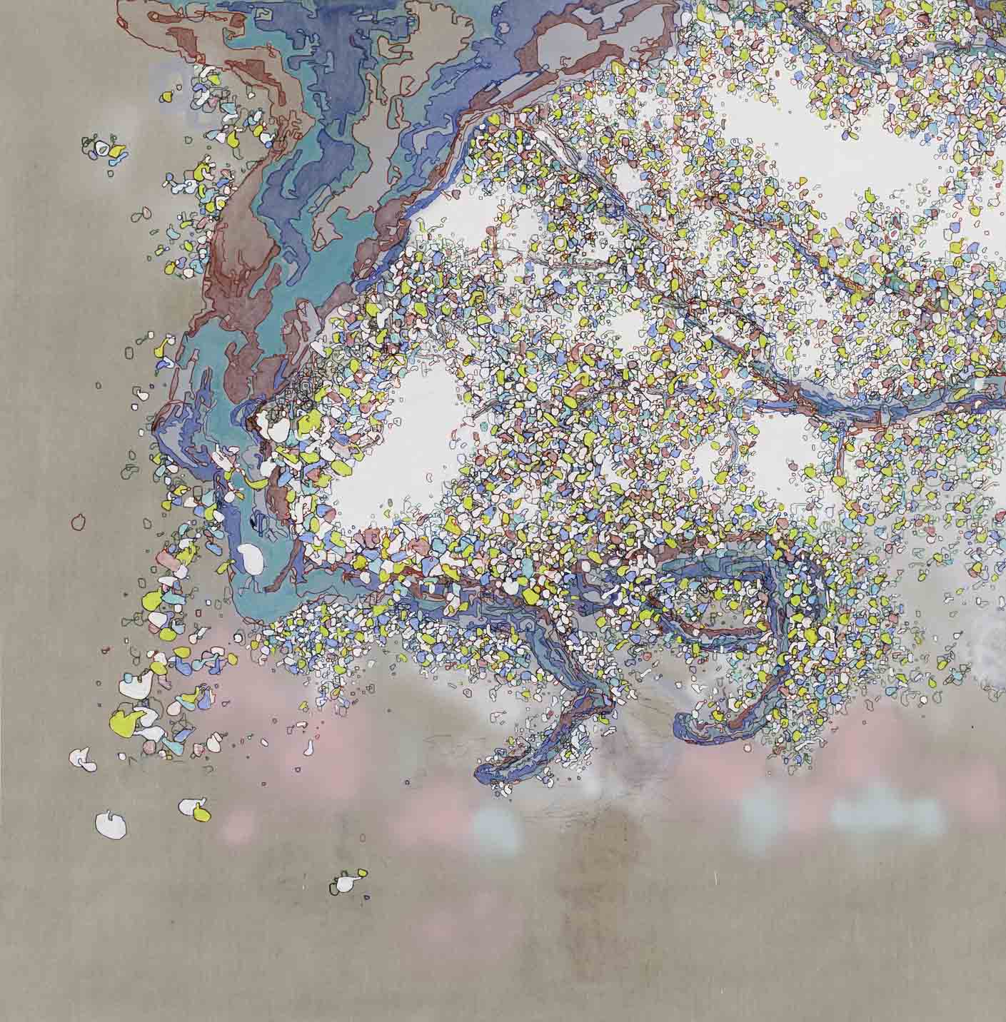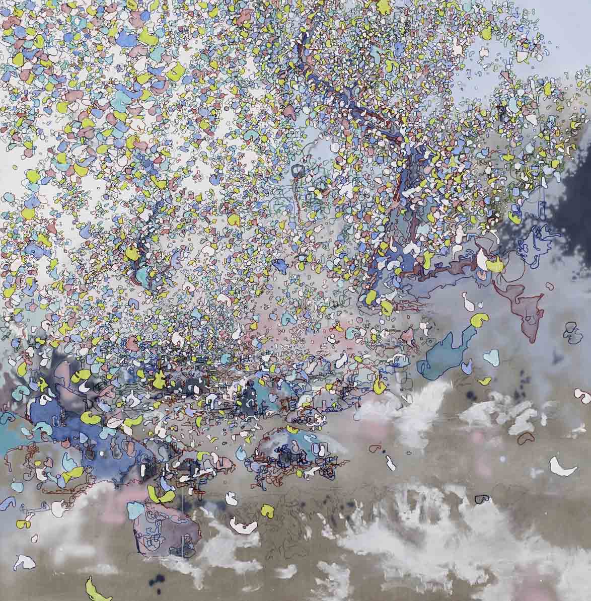 In his upcoming solo exhibition at Anna Pappas Gallery, Transmission, Carr explores the visualisation of information in transit. Central to the work is a distinct drawing process combined with specific sculptural practice. Carr’s two-dimensional works employ mapping techniques, digitisation and intuitive mark making. This enables the work to capture moments of communication – visually inferring particles and pixels caught in motion. The three-dimensional pieces operate on a different level, inferring communicative monuments offering points of intersection where the dialogue depicted can arrive or disembark. The combination of drawing process and object-based work continues Carr’s investigation into the technocratic and fluid notions of contemporary culture.