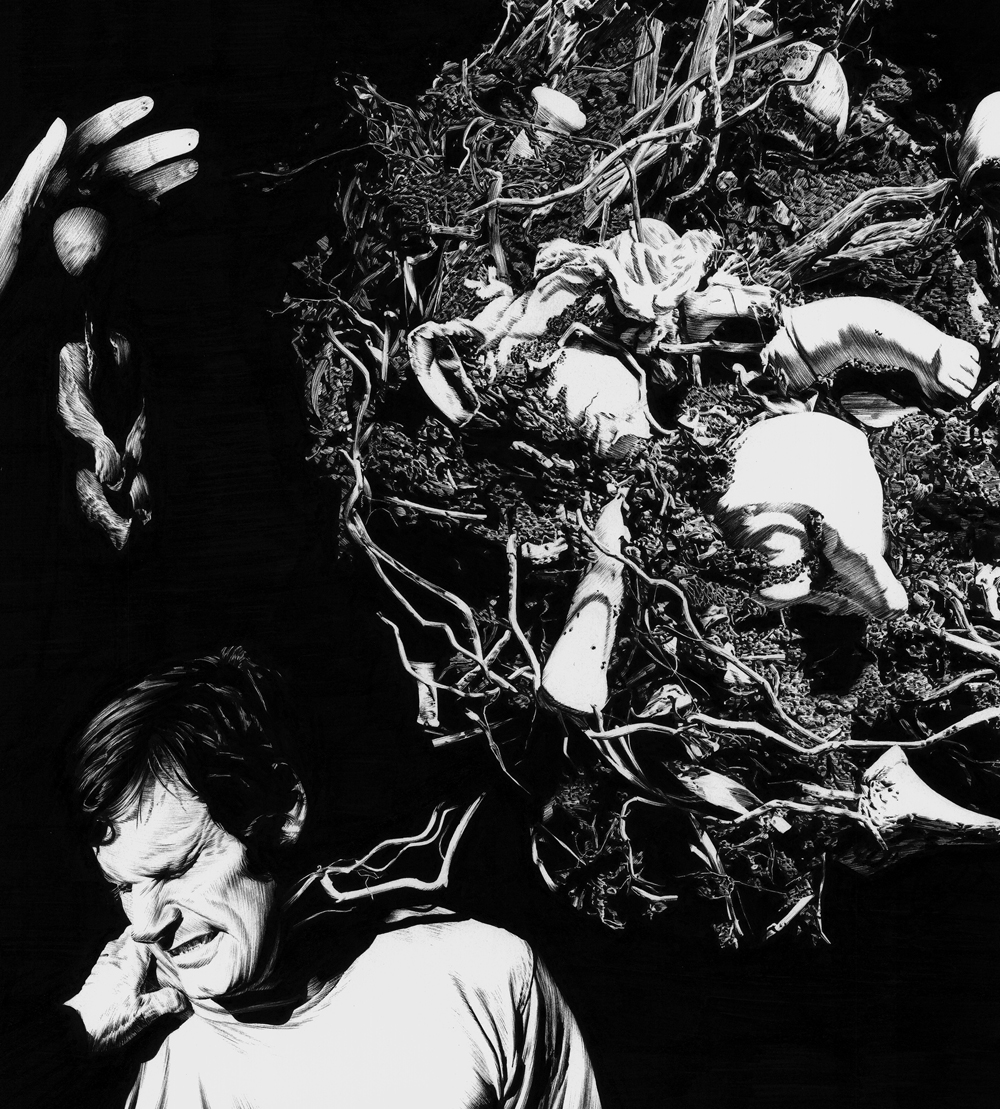 The other thing that must be said of Coyle’s work is that their execution is masterful. Made of nothing but pen on paper they are painstakingly rendered pieces. In sync with the resurgence of interest in the medium, they stand out clearly from the crowd. The manner for instance in which light and shade is brought into play brings the painters art to mind, but not the draftsman’s linear palette. Exploring their creation is rather analogous to deciphering their bewitching content. One looks to understand but in the end, the elements conspire and one must finally give in to the work.