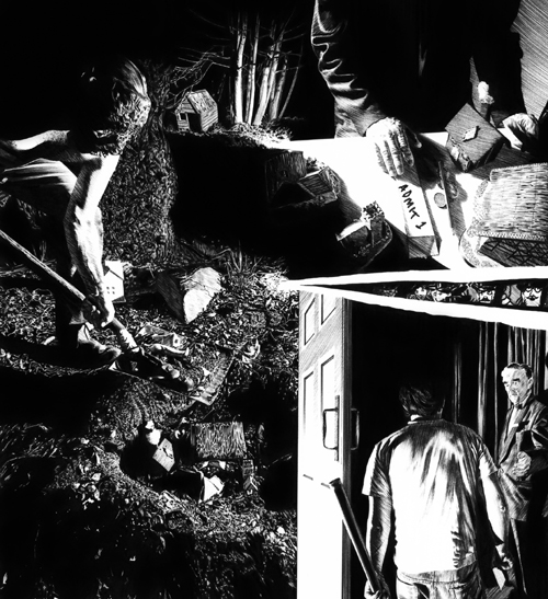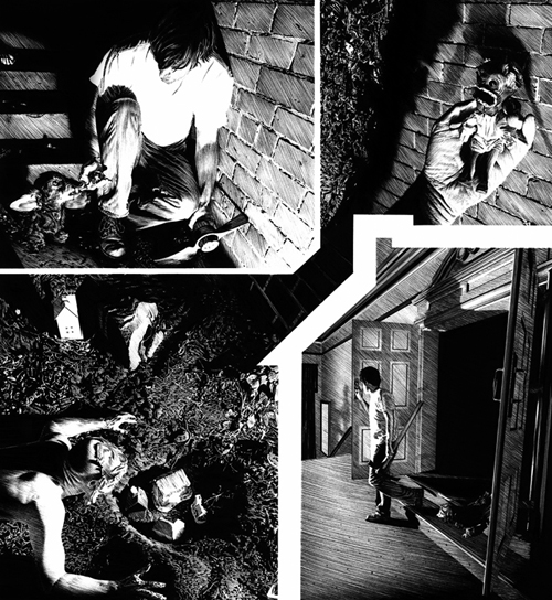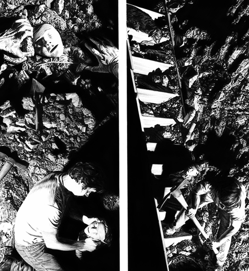Knowledge of the past, whether personally, nationally or even globally conceived is a principal upon which identity is nurtured and enriched. Tasmania for instance has a history with which the locals continue to wrestle. Violence and brutality, the convict lash and genocide: all of these mark the island’s psyche and figure altogether hauntingly in its art and film and literature. What Coyle’s protagonist is looking for is something we will never really know. It is a journey that might be cyclically conceived or progressing as if without an end. Its stylistic allusions however, to film noir and graphical novels, alerts us to its position culturally in time. Certainly he is an artist of the current era, and this I feel is of note, especially in the context of Australian history painting. Clearly Coyle’s narratives are not grand; in fact they’re decidedly unsettling and weird (wonderfully so, in a way that anticipates their potential as cinematic feature films). I like this about his work – their refusal to adopt the clichés of Australia past, whilst abandoning nothing of its eerie, isolated ferocity. In this he bisects the personal with the historic and the present in a way that cannot be ignored.