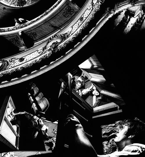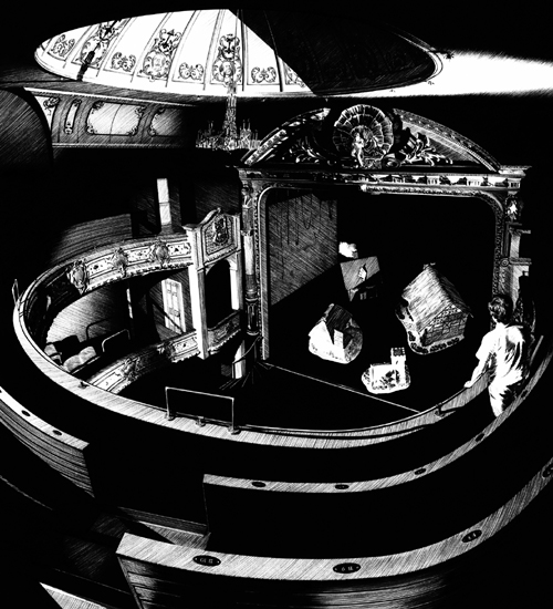 Matt Coyle’s drawings are finely crafted dream diaries though nothing about them is suggestive of surrealism’s disjunctive strategies or tropes. The old joke of course was that the Freudians dreamed in Freudian symbols, the Jungians in those favoured by Jung. Noting that ‘what goes in must come out’, it was a remark that made short work of base structural theories in so far as the unconscious mind was concerned. Nowadays neuroscientists point to plasticity as the evolutionary strength of the brain, though looking at Coyle’s disquieting practice one registers also that the mind is a self-reflective beast and art its tool for self-examination. Whilst that which is gained is perhaps a space for personal resolution and change, Coyle’s complex and layered project is intended also for public debate. Knowing then that the images in his new body of works ‘The Shades’ are scenes from Hobart’s colonial Theatre Royal, and that the ‘Shades’ is the even older colonial pub that was once on this very site, a picture begins to emerge that is not entirely of the artist’s journeying in dreamland.