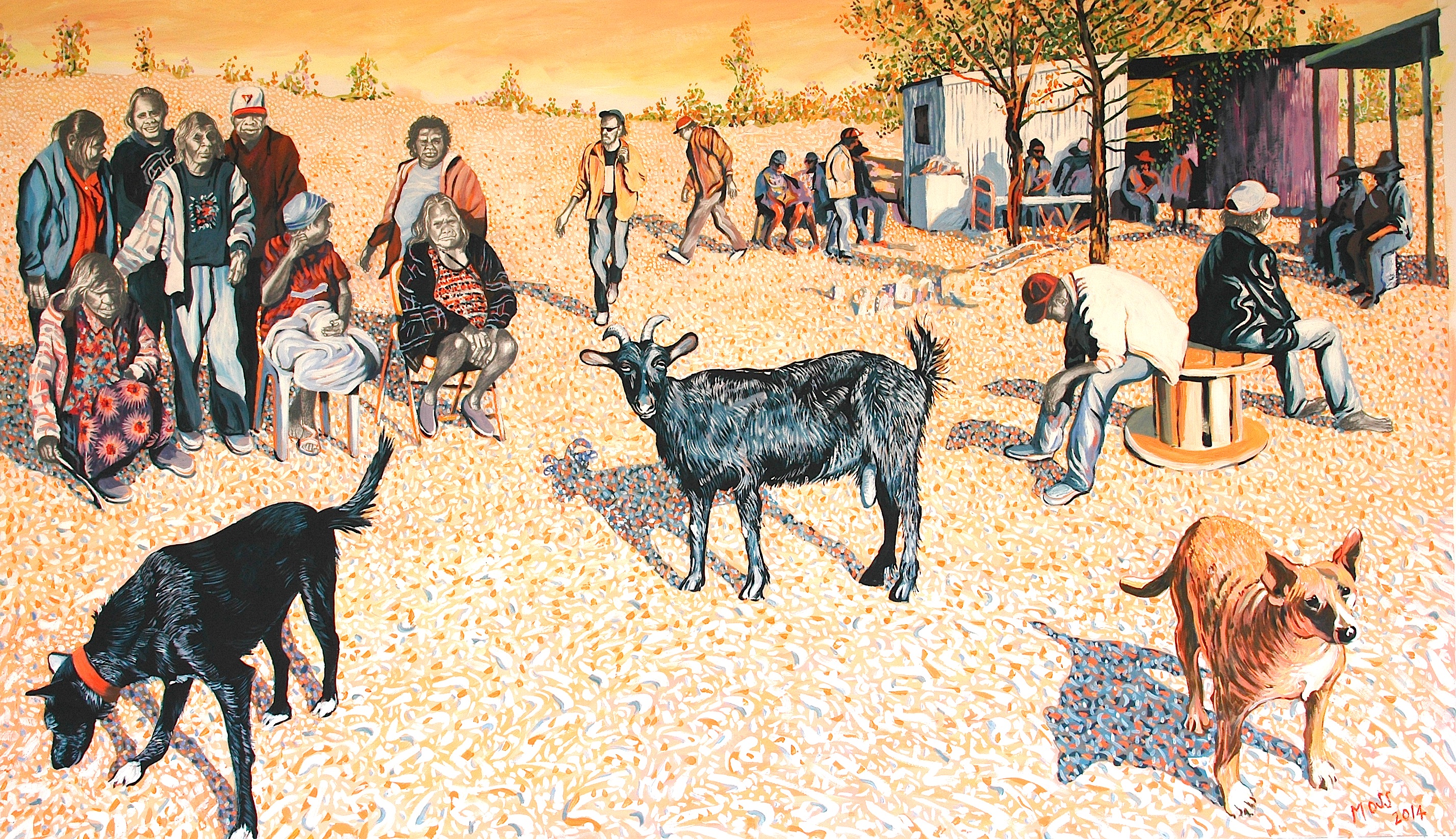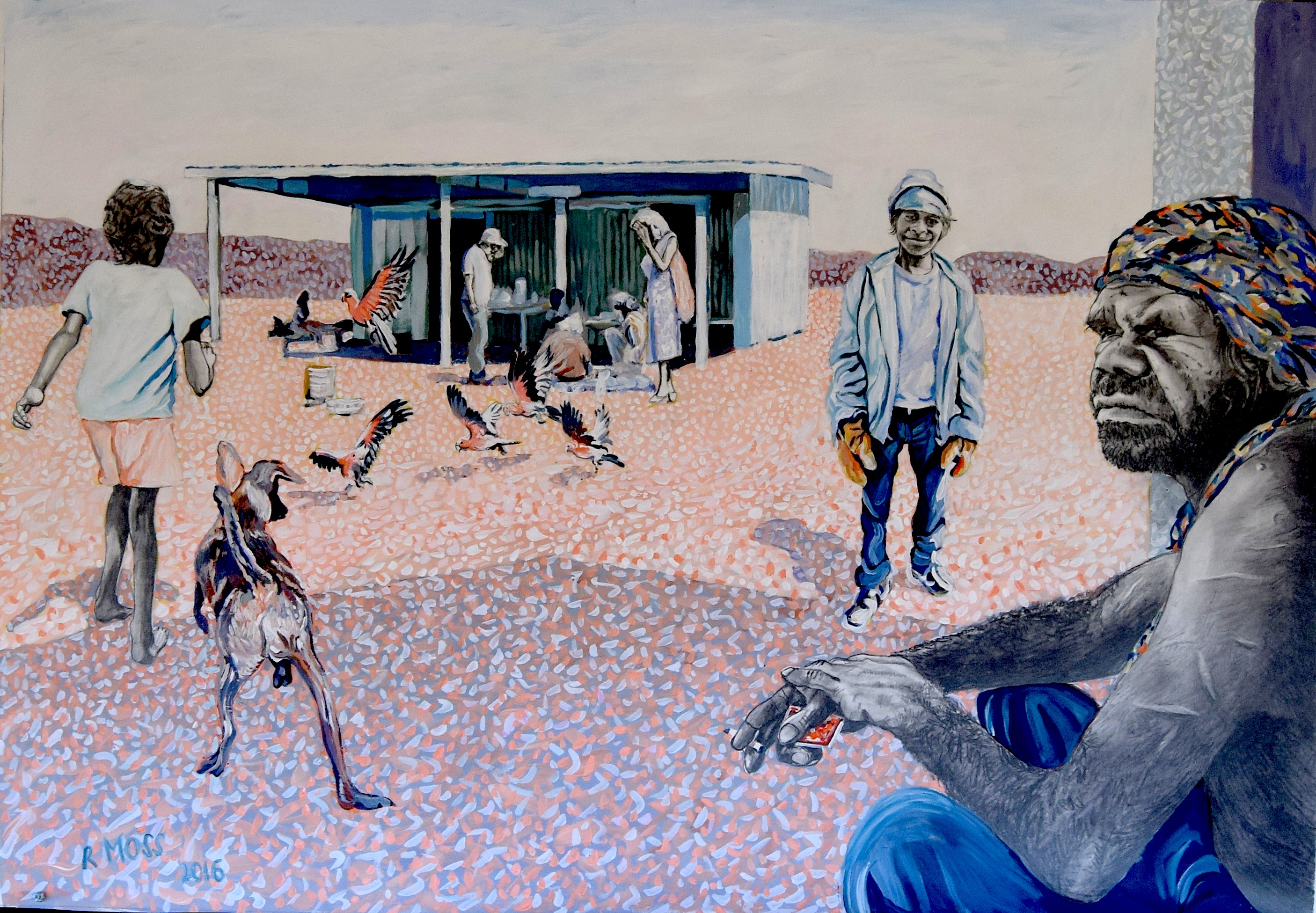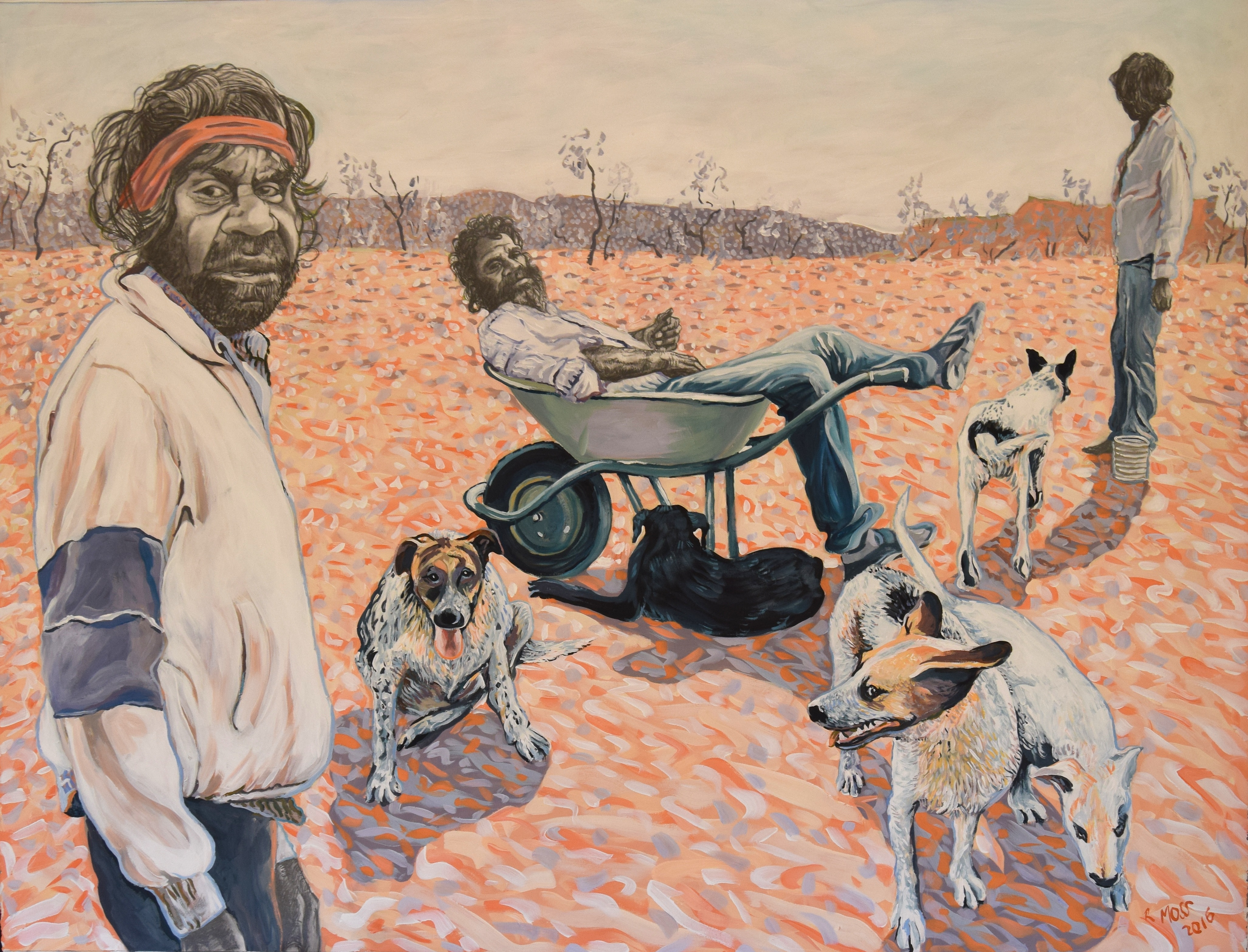 Moss’ narrative paintings show resolute scenes in which the impact of alcohol and violence are unflinchingly depicted, contrasted with tender moments showing cultural milestones and family rituals. Appropriating compositions from the Old Masters and religious paintings, his artworks are familiar yet foreign, romantic yet confronting.