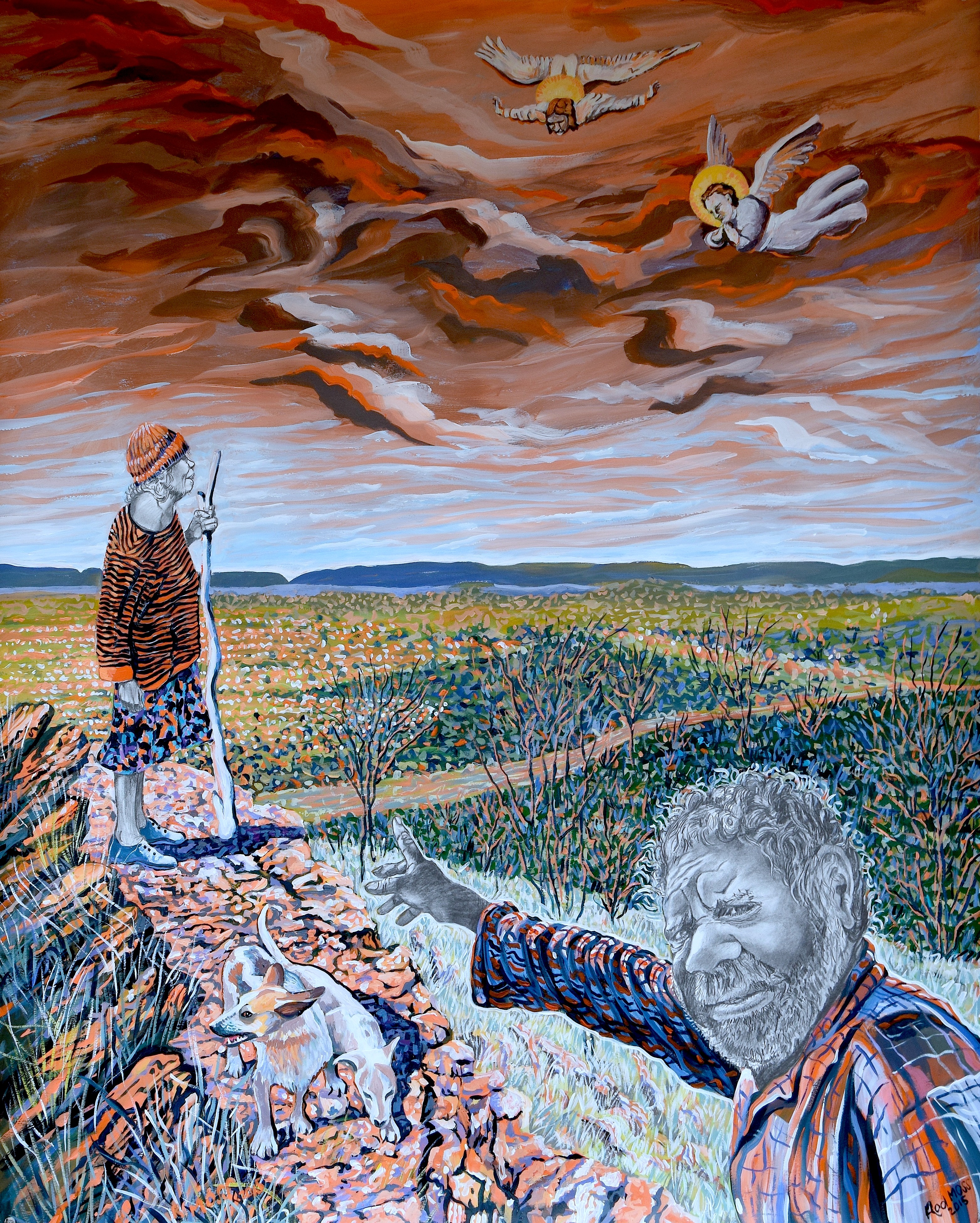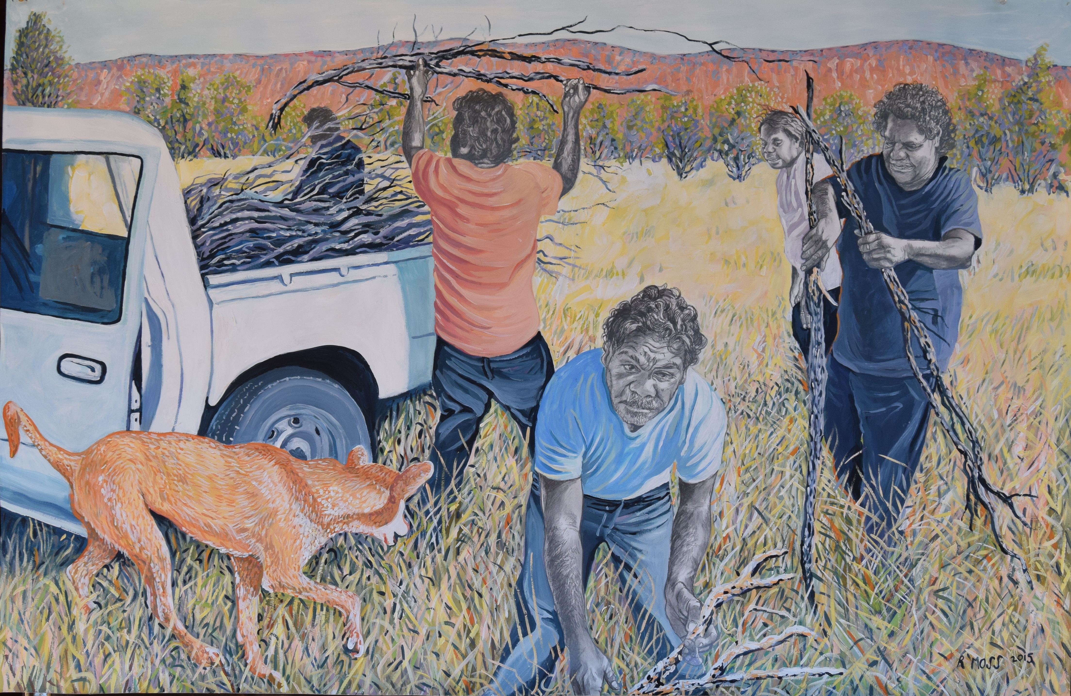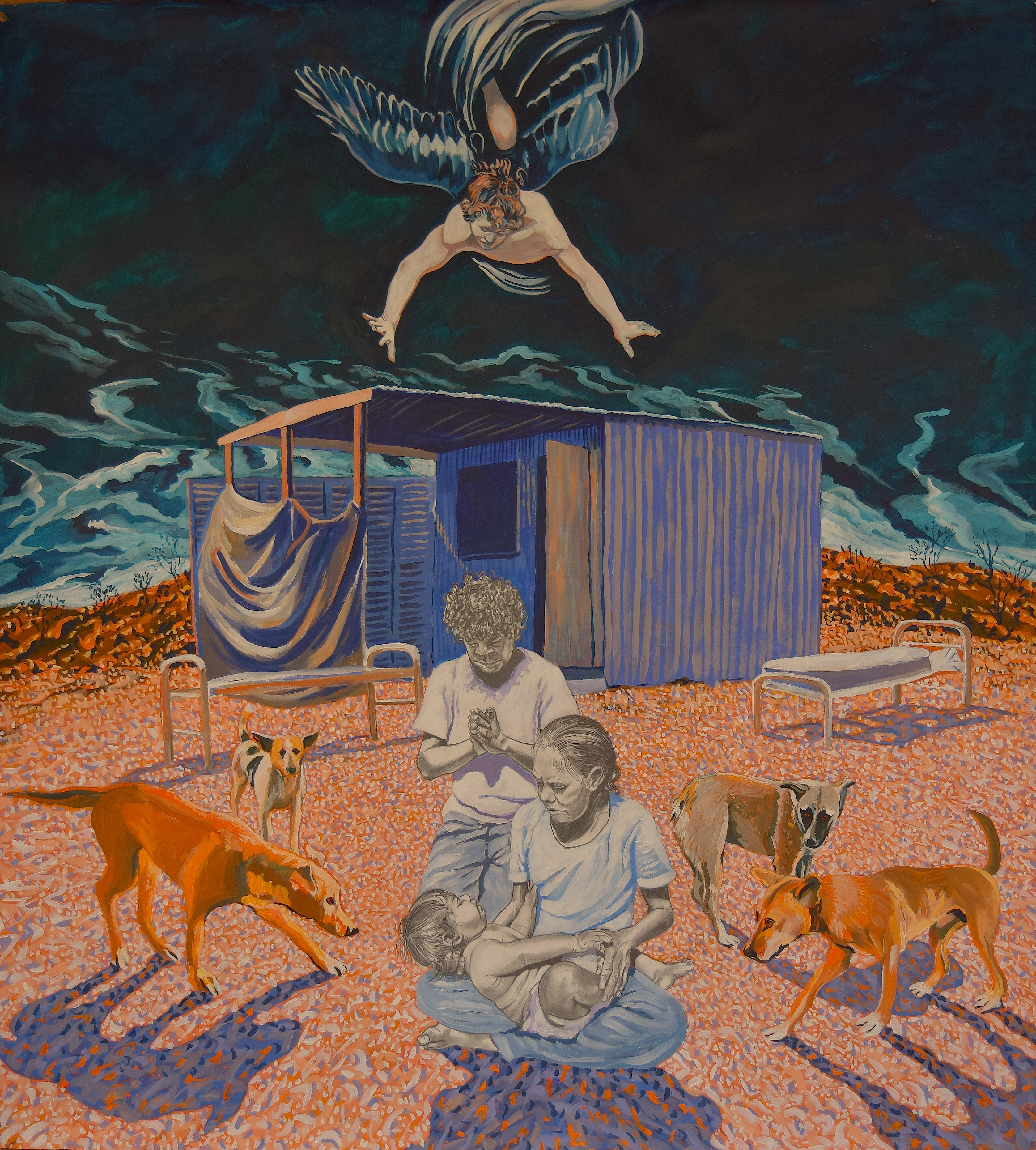 Moss’ narrative paintings show resolute scenes in which the impact of alcohol and violence are unflinchingly depicted, contrasted with tender moments showing cultural milestones and family rituals. Appropriating compositions from the Old Masters and religious paintings, his artworks are familiar yet foreign, romantic yet confronting.