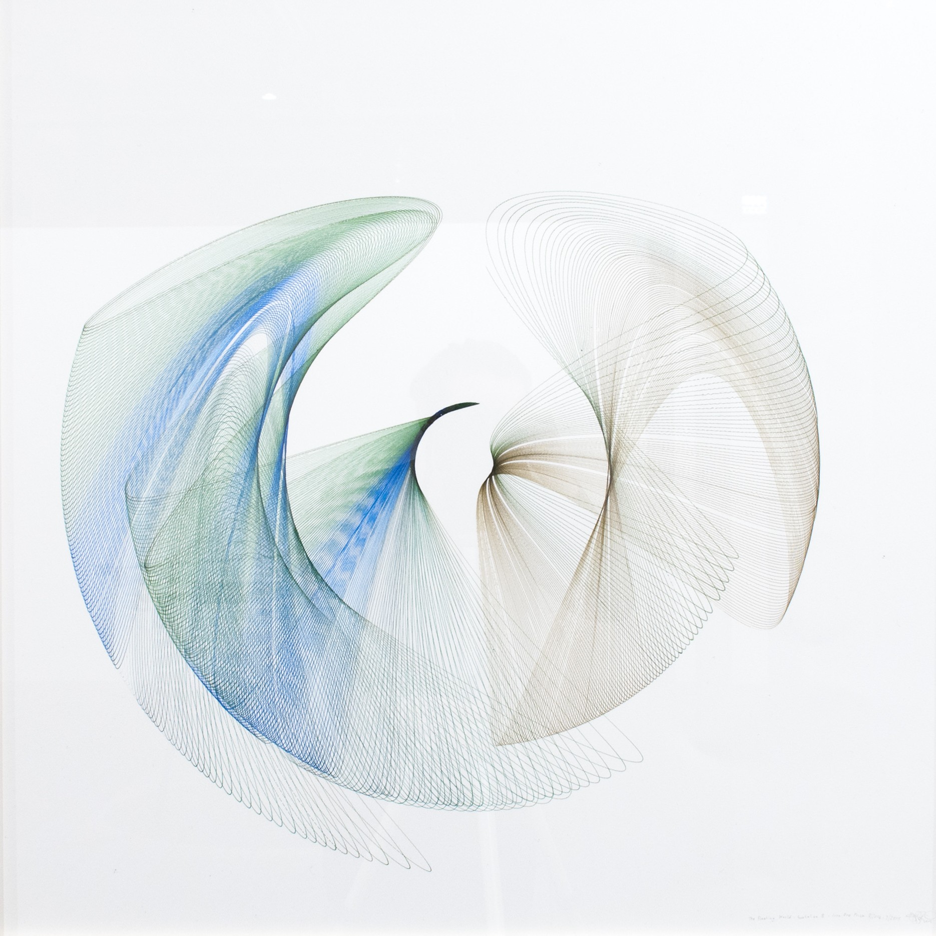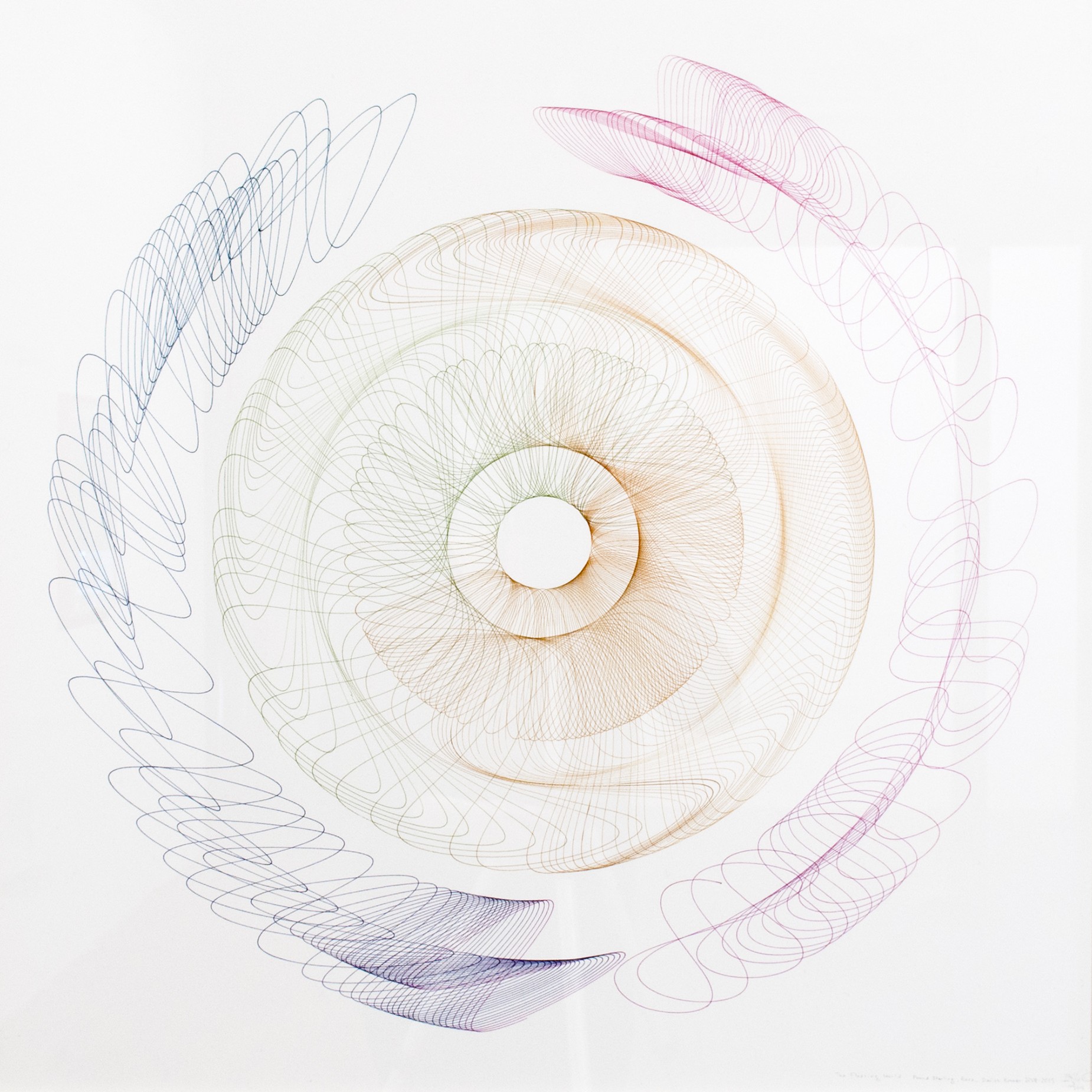In the centre of the room a drawing machine operates; inside the steel structure gears slowly turn, bearings roll and counterweights tremble as a pivoting arm drags a pen in a looping curve across a sheet of paper. As the pen draws, the table that holds the paper slowly revolves, and as it turns the loop becomes a spiral; a curving grid that falls back on itself as the pen describes the subtly varying orbits of the drawing arm.
