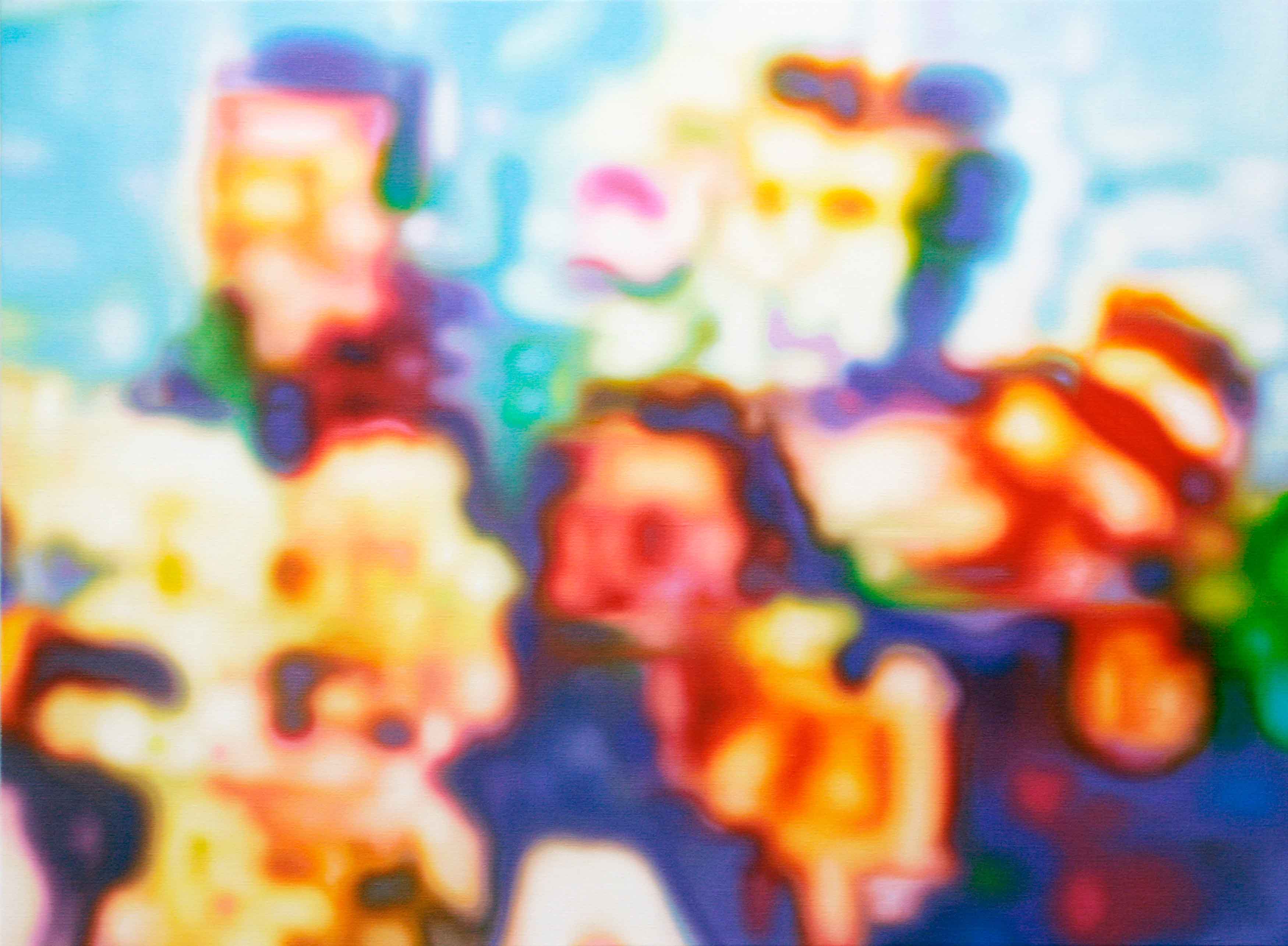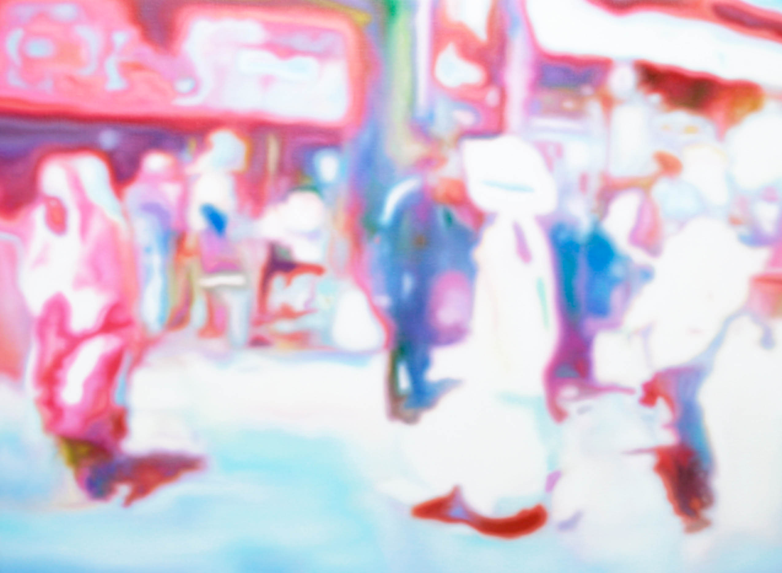 Stephen Giblett’s recent paintings in Low Fidelity draw a parallel between Lo-Fi music and low-resolution imagery taken from iPhone screen-shots and the Internet. The technical flaws from the original files provide avenues for creativity in that they create a distance between the ‘idea’ of what is seen and what is actually presented –  a shift from idealistic photorealism to freedom at the foot of abstraction.