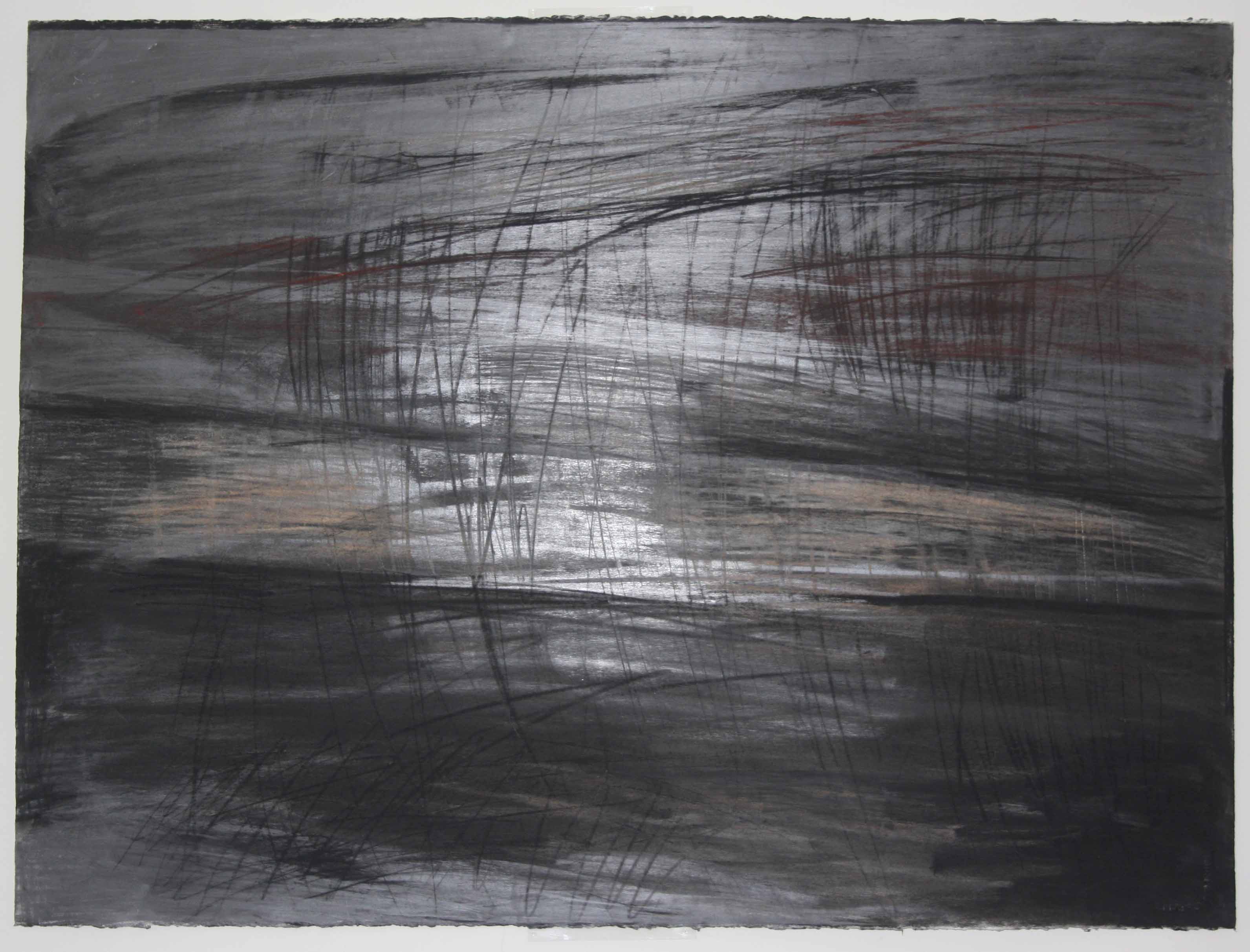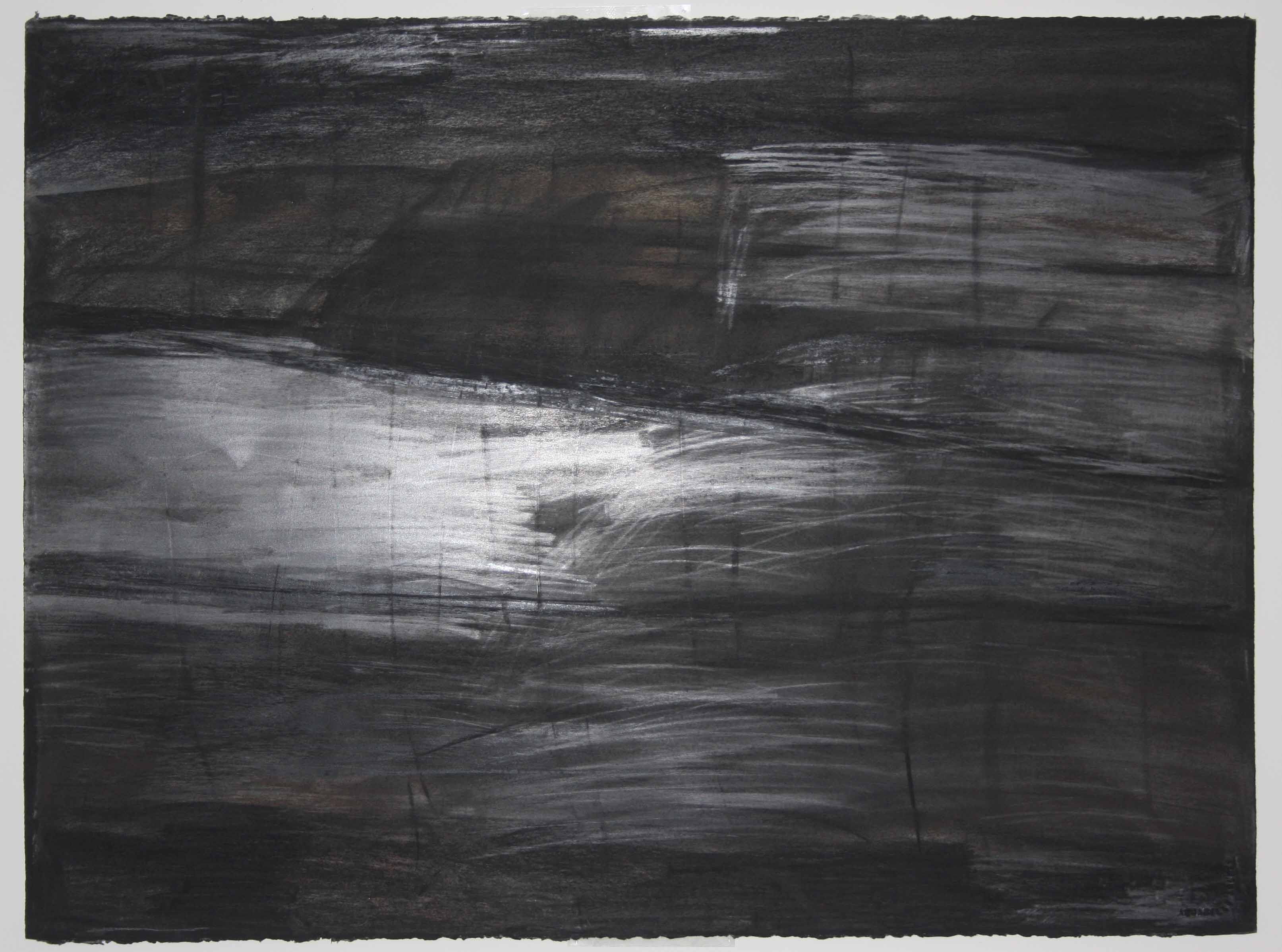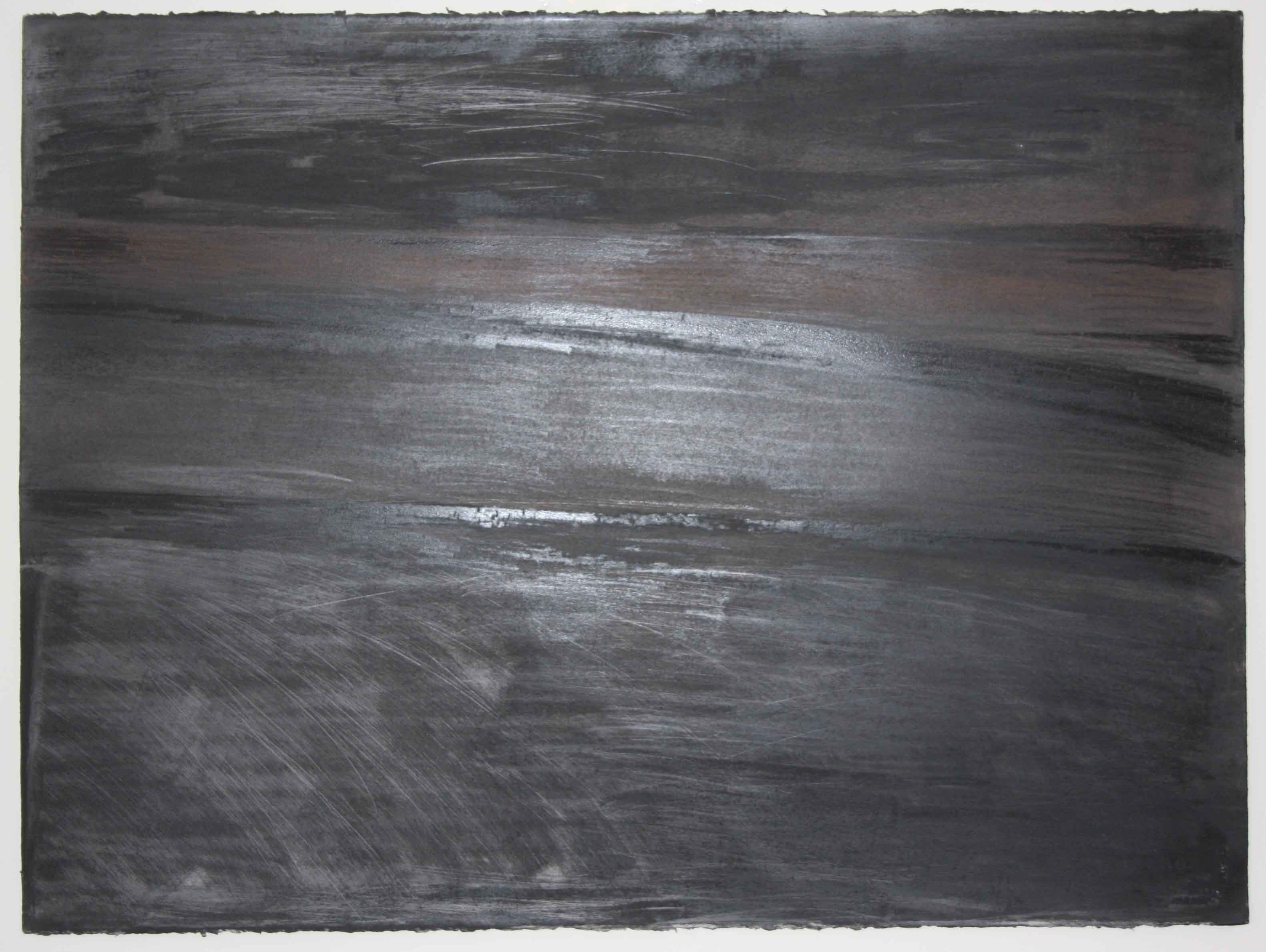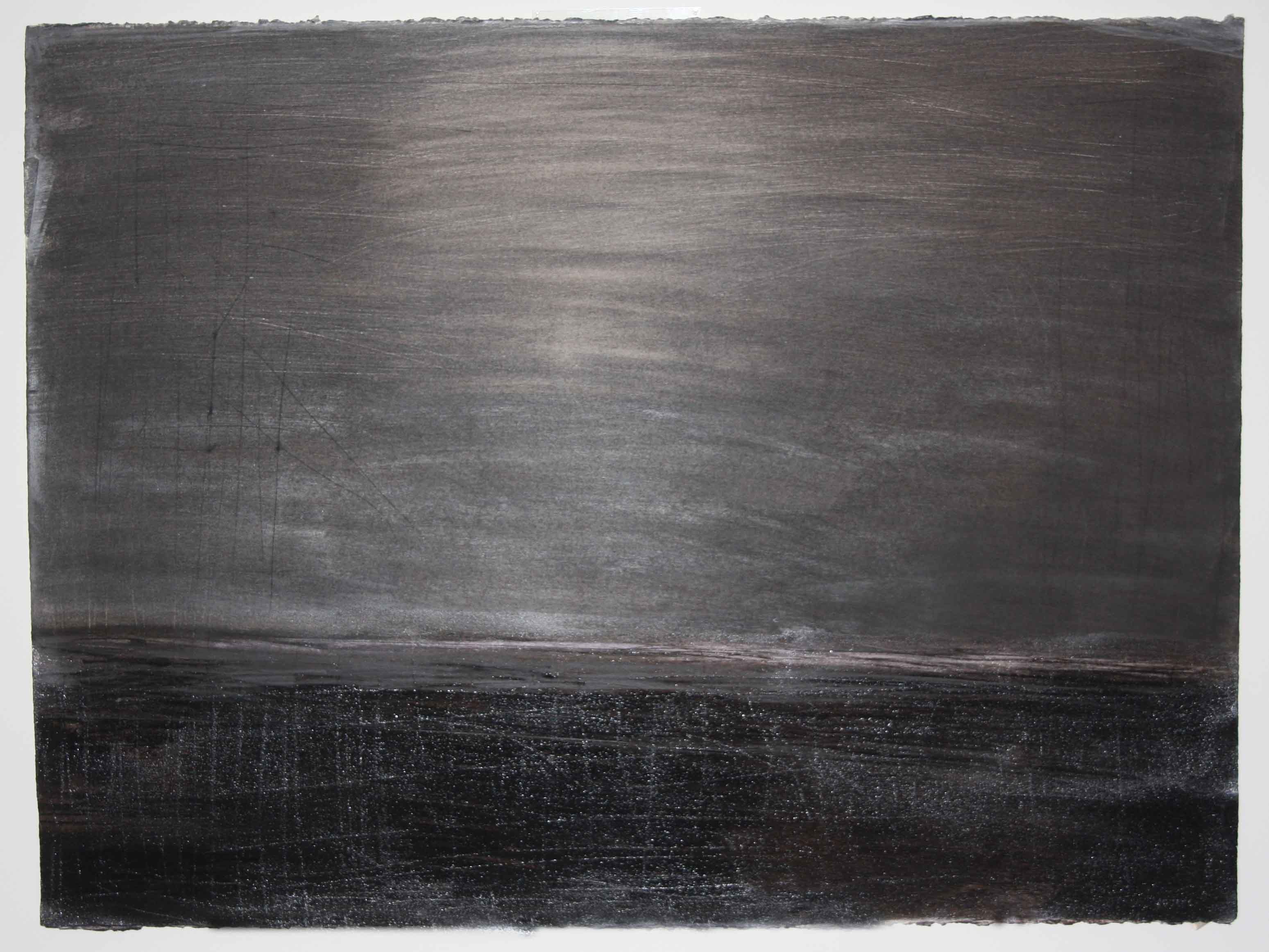 The physical surface of paper works is violated with tools such as scrapers, burnishers and sandpaper creating an almost sculptural feel that invokes the materiality of stretched skin or a dark sky, while photographs are manipulated to stress a level of tension and vulnerability. These strong physical compositions that play with a protrusion and recession of form are fragmented by a sensuality and fragility that belies a contradiction of content and image.
